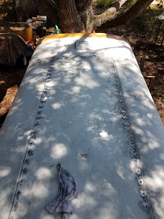 The holes were filled with Bondo on a patch of window screen material, and then the whole floor liberally coated with a primer of Rustoleum.